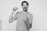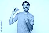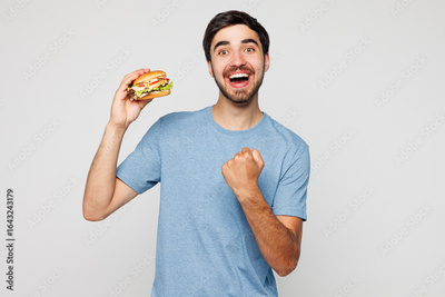 Young man wear blue t-shirt casual clothes hold eat bite burger do winner gesture clench fist celebrate isolated on plain solid white background Proper nutrition healthy food unhealthy choice concept