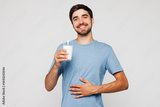 Young smiling happy man wear blue t-shirt casual clothes hold in hand glass of milk put arm on belly isolated on plain solid white background. Proper nutrition healthy food unhealthy choice concept.