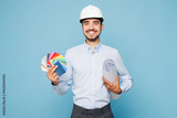 Young smiling architect engineer designer employee man wears white clothes shirt hardhat hold blueprints color palette isolated on plain light blue background studio portrait. Work on build project.