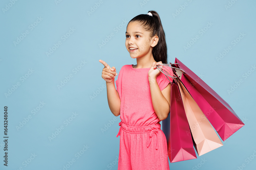 Little kid girl 9-10 years old wear pink clothes hold in hand paper package bags after shopping point index finger aside on area isolated on plain blue background. Black Friday sale buy day concept.