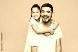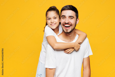 Young smiling parent man have fun with child girl in casual blue pyjamas clothes. Daddy little kid daughter posing hugging cuddle isolated on plain yellow background. Father's Day Love family concept.