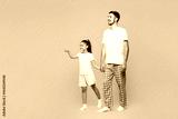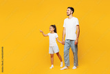 Full body young parent man with child girl wear casual blue pyjamas clothes. Daddy little kid daughter walk go point finger aside isolated on plain yellow background. Father's Day Love family concept.