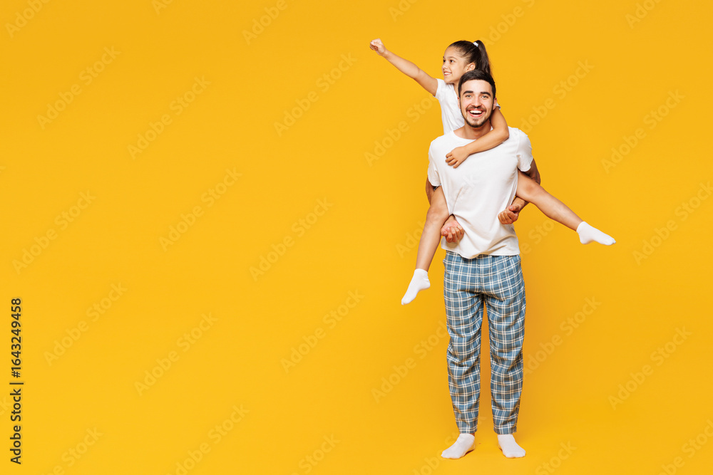 Full body young parent man with child girl wear blue pyjamas clothes. Daddy little kid giving piggyback ride to joyful clench fist isolated on plain yellow background Father's Day Love family concept
