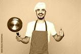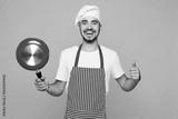 Young happy housewife housekeeper chef cook baker man wear red apron toque hat hold in hand frying pan show thumb up isolated on plain yellow orange background studio portrait. Cooking food concept.