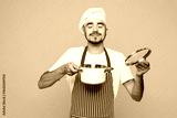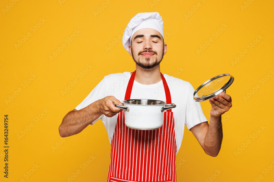 Young housewife housekeeper chef cook baker man wears red apron toque hat hold in hand saucepan open lid enjoy smell isolated on plain yellow orange background studio portrait. Cooking food concept.