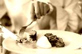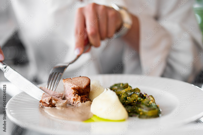 Close-up of a person cutting meat with knife and fork on a plate with mashed potatoes, green vegetables, and sauce. Tasty meal presentation and dining concept.