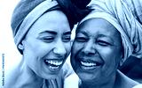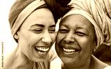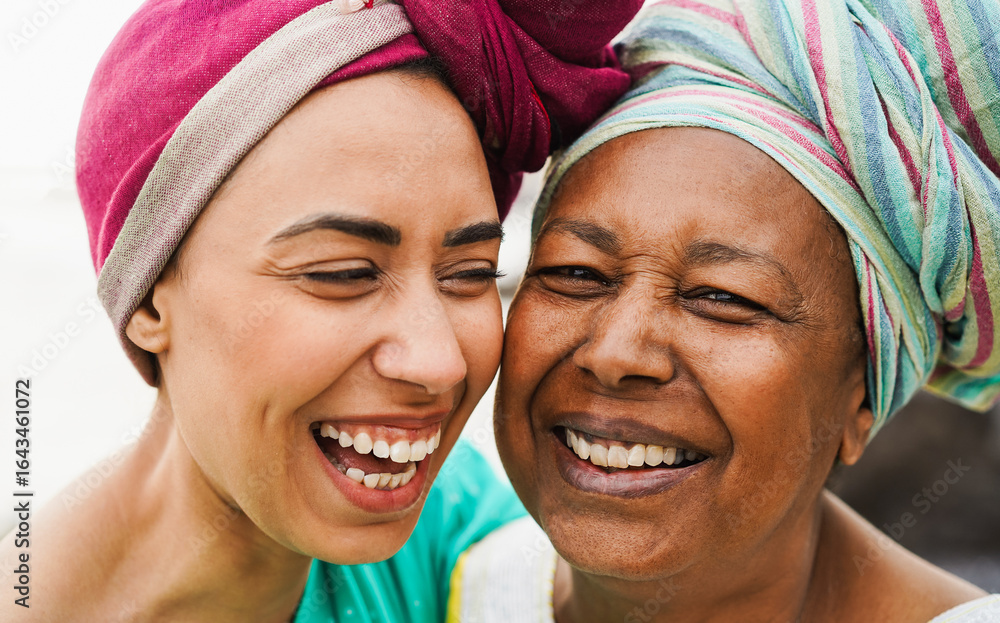 Happy african mother and daughter smiling on camera - Travel, ethnic culture and family concept - Main focus on mom face