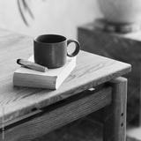 Creative composition of elegant wooden dining table. Beautiful home decorations and accessories. Modern home interior design. Wabi-sabi inspiration. Template.