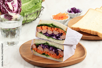 Sausage Sandwich with Carrot, Lettuce, and Purple Cabbage