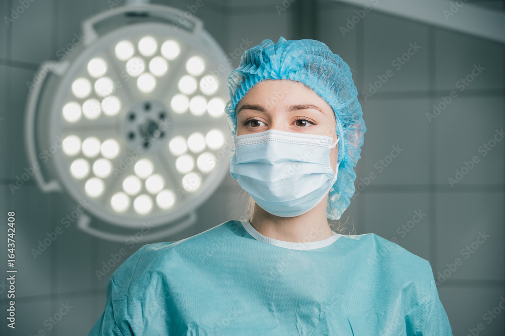 Female surgeon in blue surgical attire and mask, standing confidently in an operating room, illuminated by bright surgical lights, ready to perform a critical medical procedure with precision and care