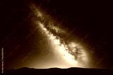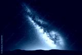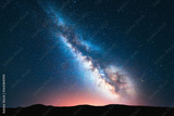 Milky Way. Fantastic night landscape with bright milky way, sky full of stars, yellow light and hills. Shiny stars. Picturesque scene with our universe. Space background. Amazing astrophotography