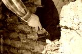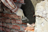 A professional builder bricklayer with hand trowel applies cement mortar to the brick wall in front of the lining during the restoration of the site in front of the cinema