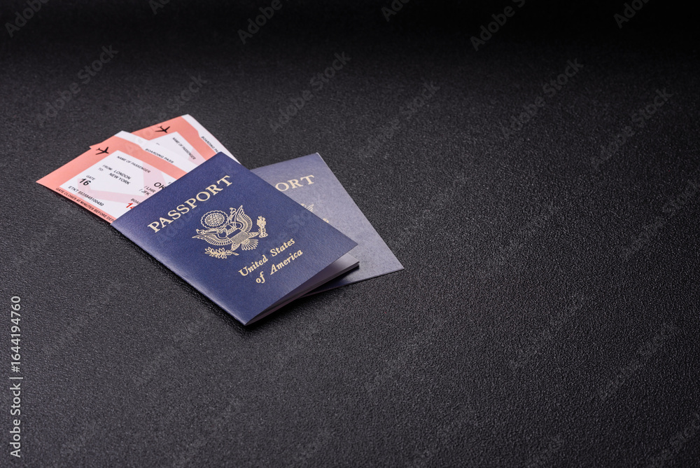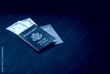 US passport or id document with tickets for flight, travel, border crossing. US passport and tickets