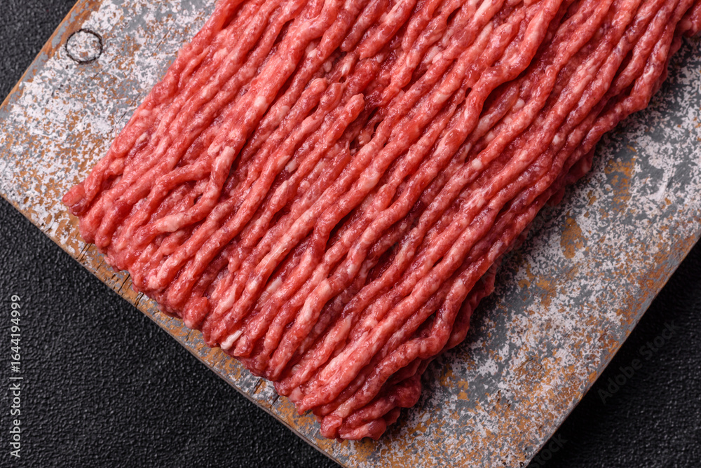 Raw minced beef or pork, ground meat for burgers. Raw minced meat