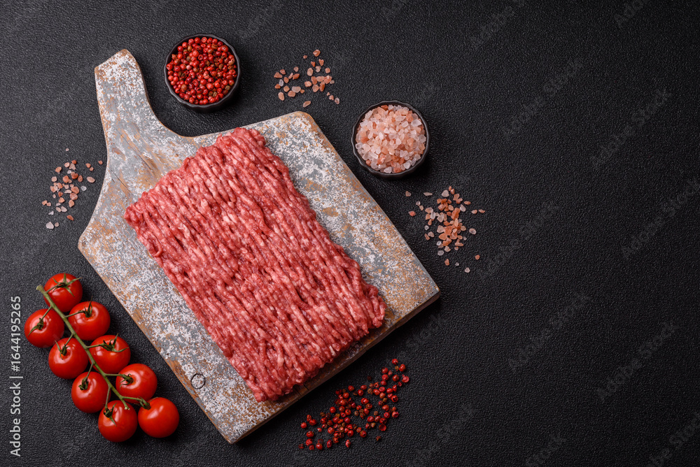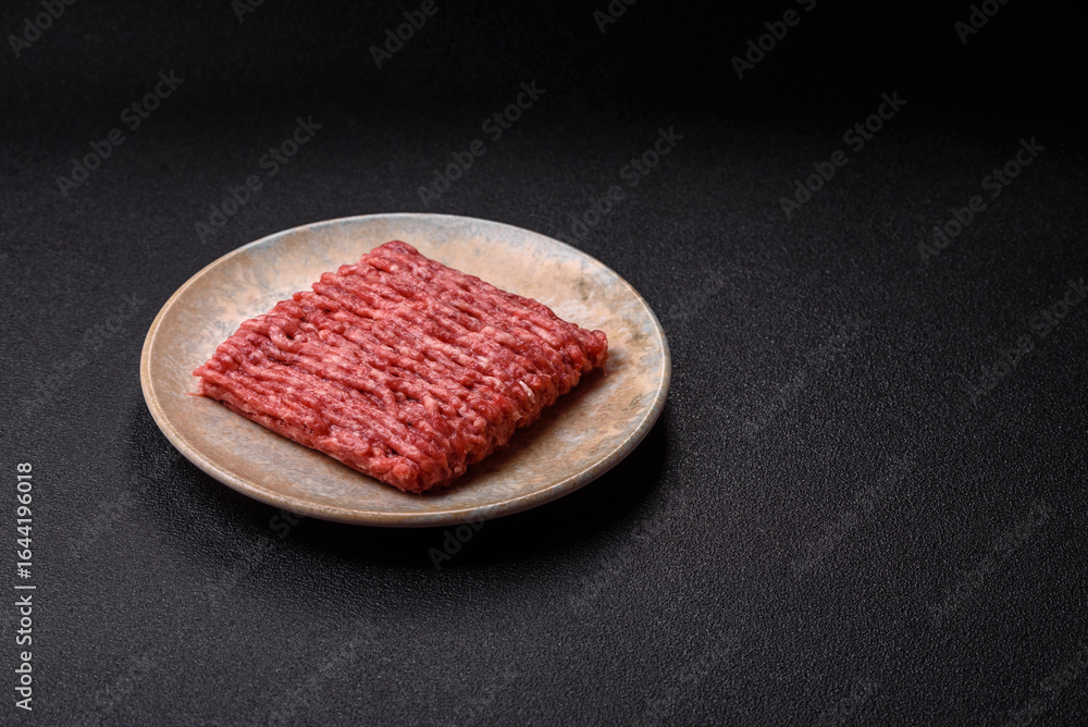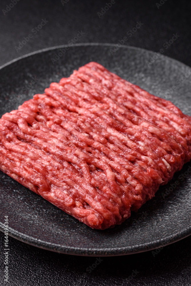 Raw minced beef or pork, ground meat for burgers. Raw minced meat