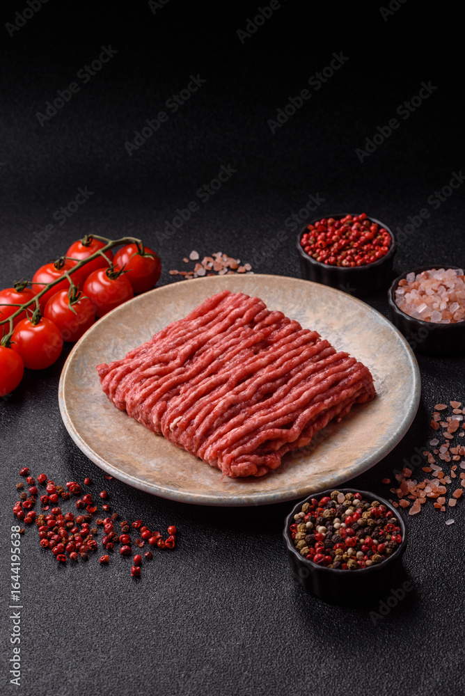 Raw minced beef or pork, ground meat for burgers. Raw minced meat