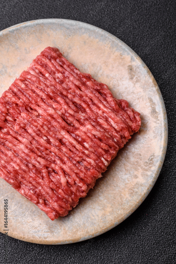 Raw minced beef or pork, ground meat for burgers. Raw minced meat