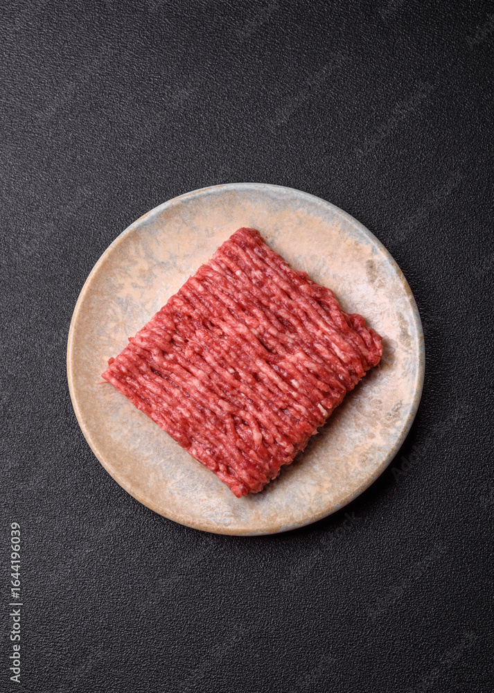 Raw minced beef or pork, ground meat for burgers. Raw minced meat