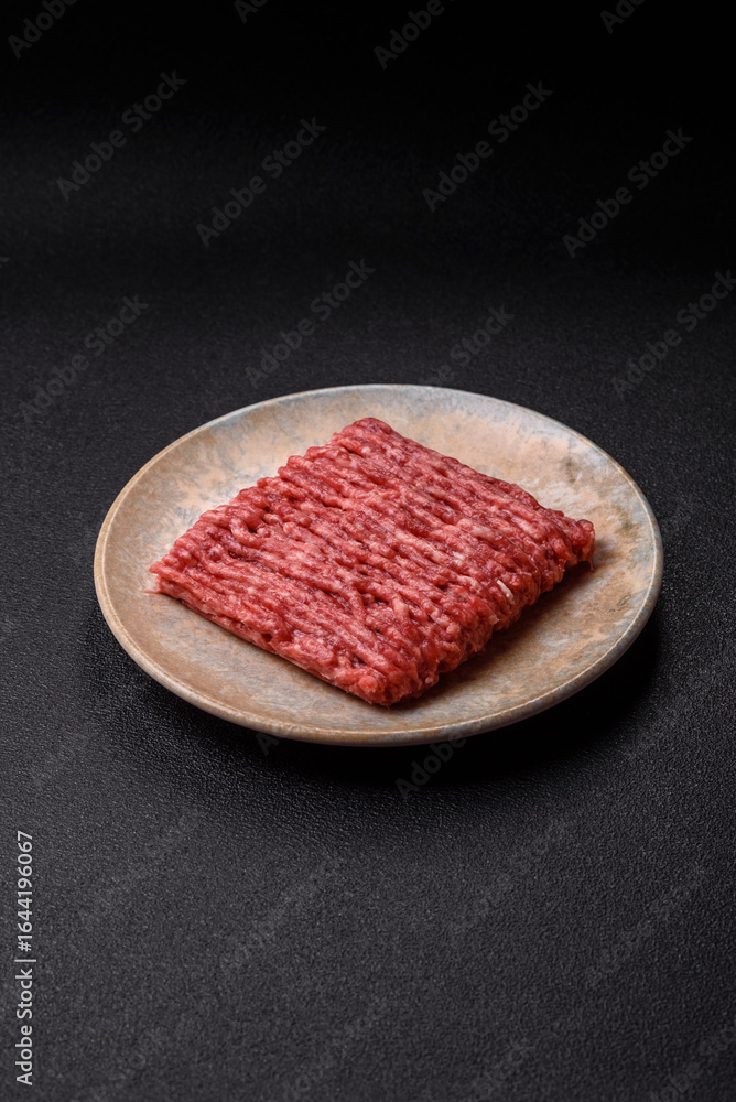 Raw minced beef or pork, ground meat for burgers. Raw minced meat