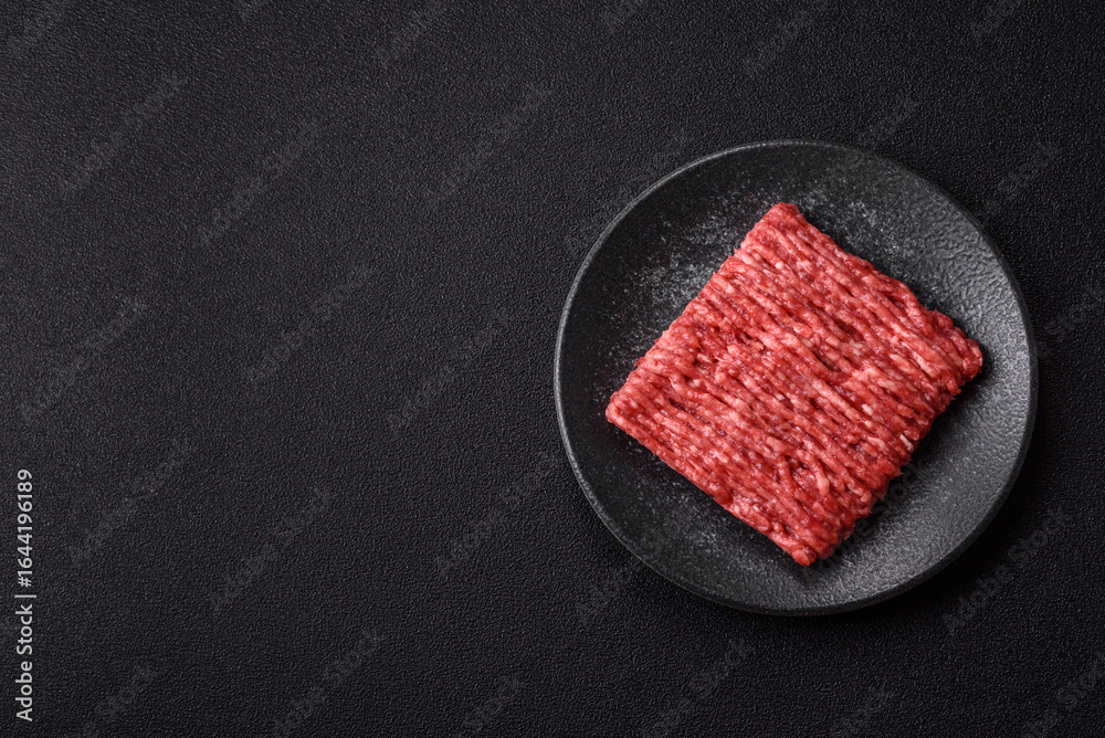 Raw minced beef or pork, ground meat for burgers. Raw minced meat