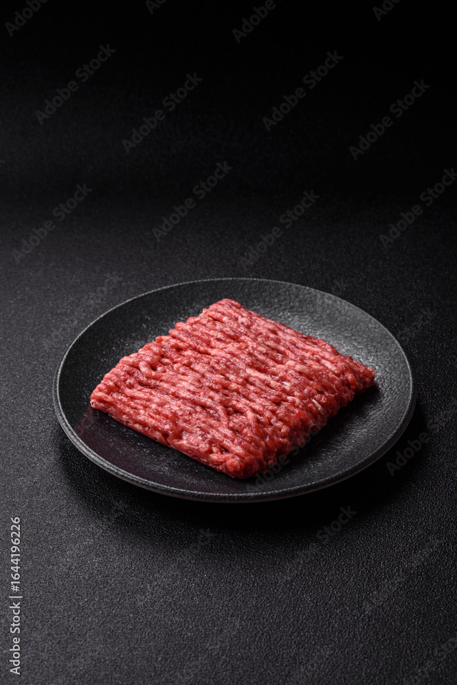 Raw minced beef or pork, ground meat for burgers. Raw minced meat