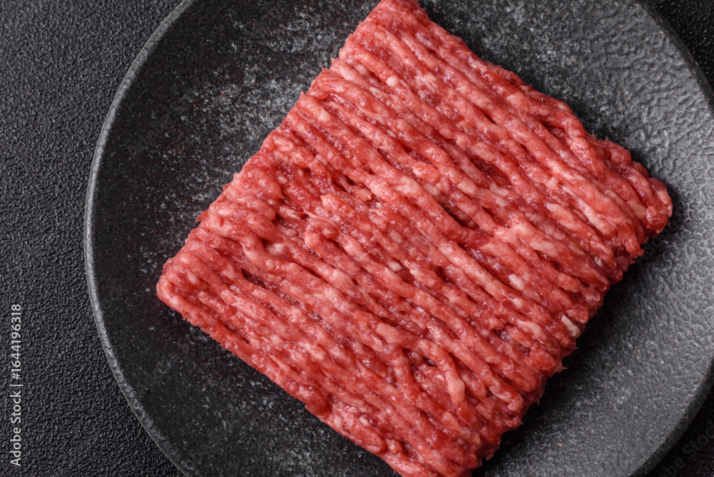 Raw minced beef or pork, ground meat for burgers. Raw minced meat
