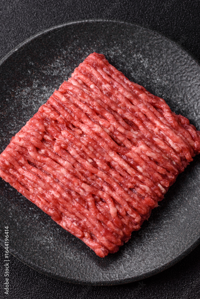 Raw minced beef or pork, ground meat for burgers. Raw minced meat