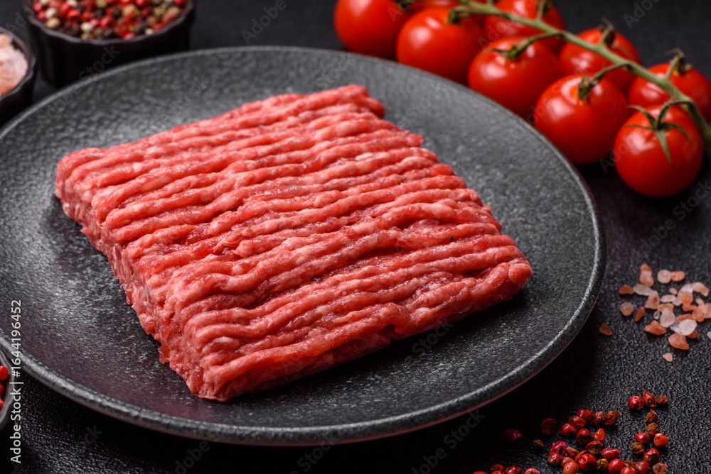 Raw minced beef or pork, ground meat for burgers. Raw minced meat