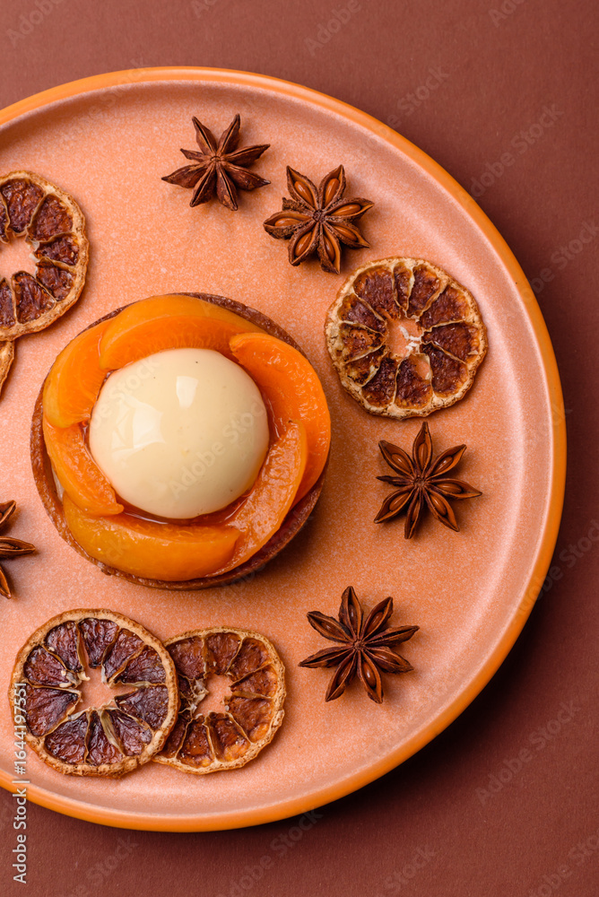 Pie, sweet round tart with apricot pieces, cream and nuts. Sweet tart with peach