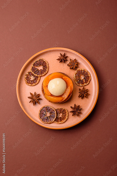 Pie, sweet round tart with apricot pieces, cream and nuts. Sweet tart with peach