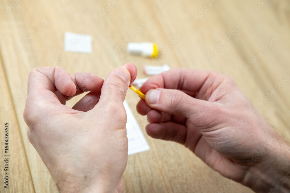 Hand pricking finger with lancet for blood self-test, process at-home health checks, Monitoring hemoglobin levels and anemia, Hormones Tests, health diagnostics, home blood type test