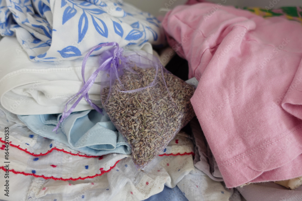 Lavender sachet among neatly folded clothes in a bedroom