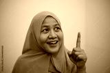 Asian muslim woman thinking something with smile on her face, happy positive, pointing up having good idea expression
