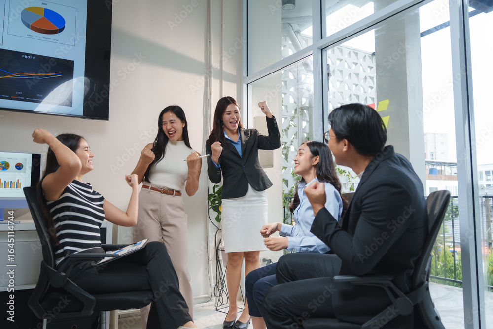 Excited business team celebrating success in modern office