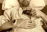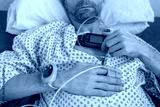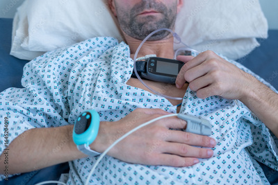 Young person, man with sleep apnea monitoring device and fingertip pulse oximeter, male patient health tracker, adolescent sleep study equipment, youth breathing disorder research concept