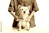 Veterinarian doctor checking a westie terrier dog with a stethoscope