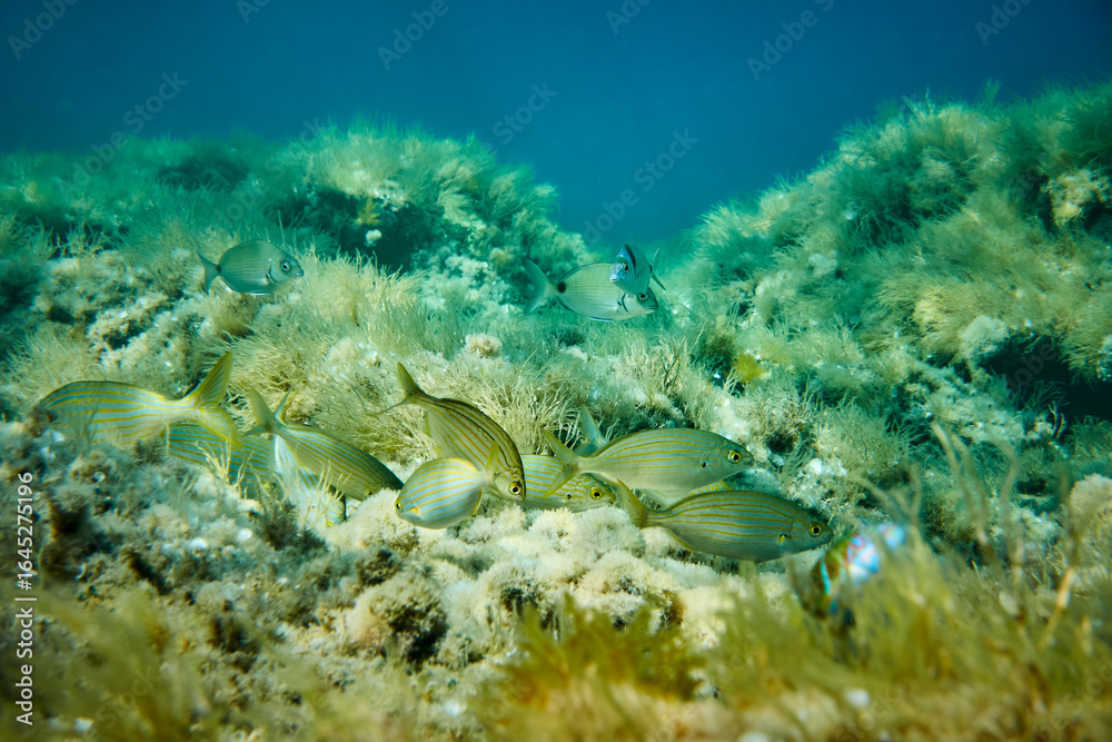 Water animals Sargo or white seabream fish Underwater in sea Sea life Mediterranean sea Scuba diver point of view