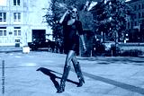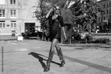 Stylish woman in black sequin mini dress and glitter knee-high boots posing confidently on sunny city street in modern urban setting