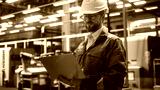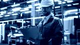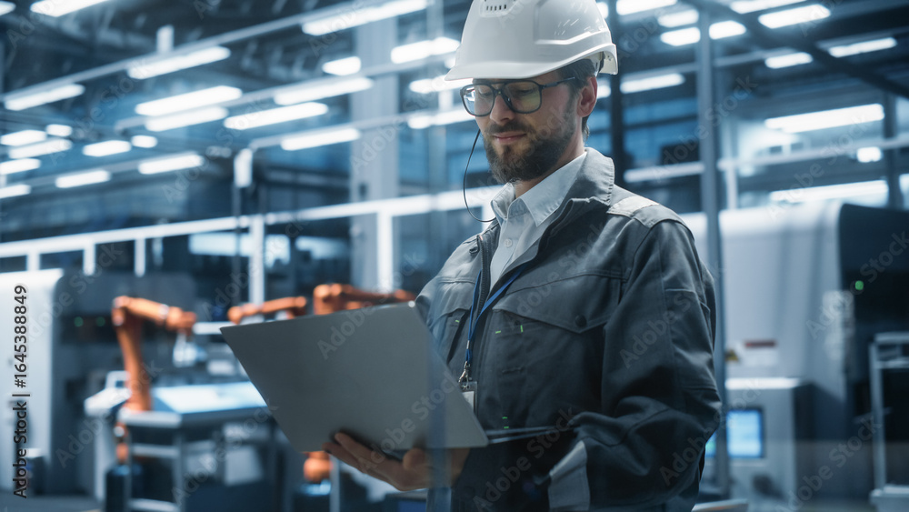 Factory Office: Portrait of Confident Caucasian Male Chief Engineer Wearing Hard Hat Working on Laptop Computer. Technician At Automated Robot Arm Assembly Line Manufacturing Electric Components.