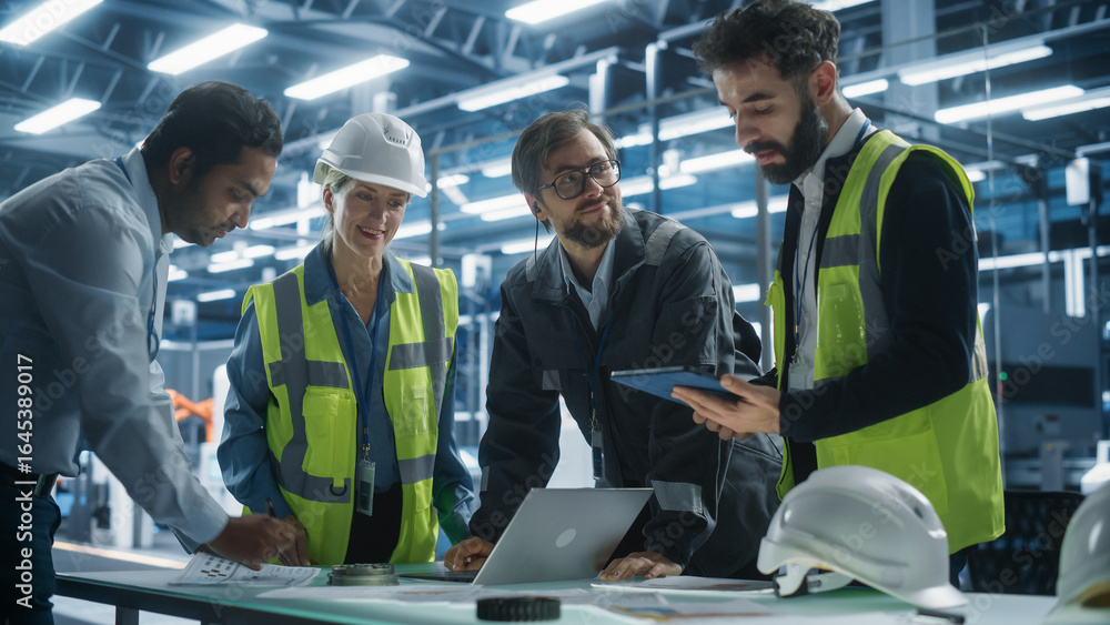 Meeting At Industrial Factory Office: Diverse Aerospace Engineers Using Laptop And Tablet With Blueprints For New Sustainable Jet Engine. Facility With Autonomous Assembly Line With Robotic Arms.
