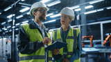 Portrait of Caucasian Male Process Engineer and Female Production Supervisor Standing In Factory Hall, Using Laptop, and Discussing Production at Automated Manufacturing Plant with Robot Arms.