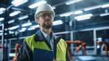Industrial Engineer Smiling, Looking at Camera. Portrait of a Caucasian Man in Protective White Hardhat and Reflective Jacket. Specialist Monitoring AI Powered Assembly Line With Robot Arms At Factory