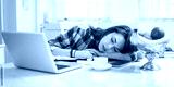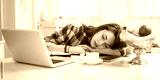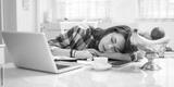 Panoramic view of tired student girl with laptop, books and coffee sleeping on the table.