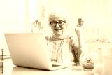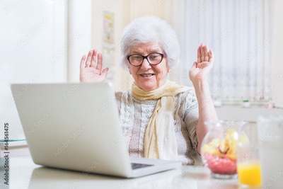Surprised senior woman communicating via instant messaging apps on laptop.