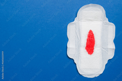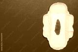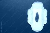 Women hygiene products or Sanitary pad with red feather on colored background. Pastel color. Closeup. Empty place for text. Female daily hygiene