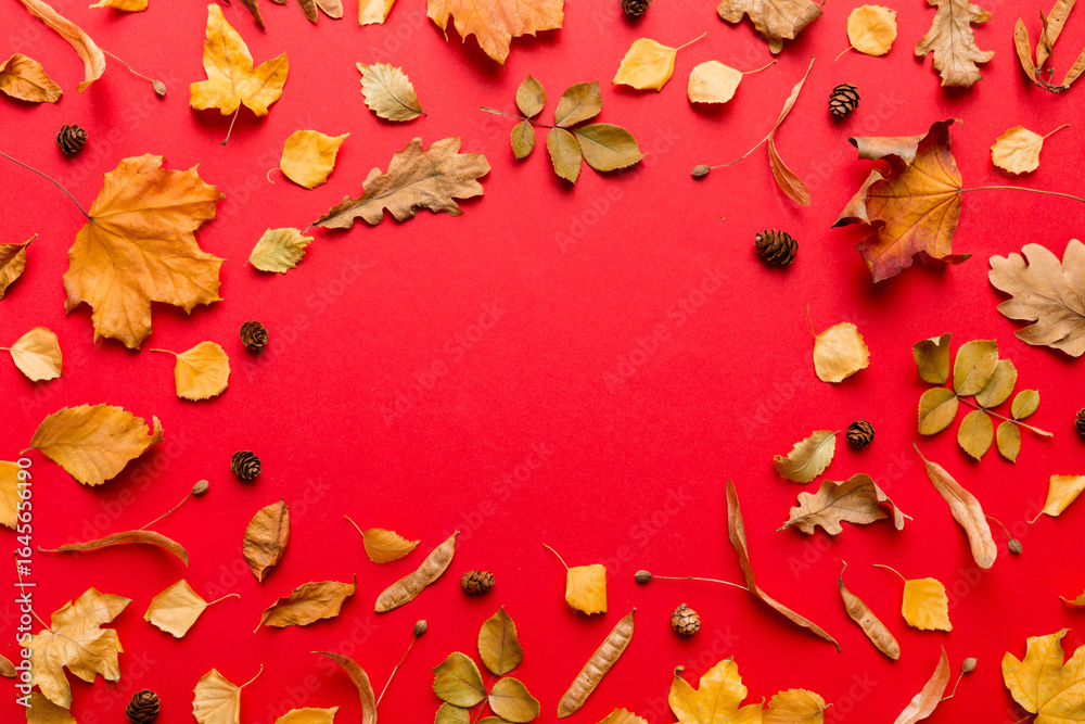 Autumn composition made of dried leaves, cones and acorns on table. Flat lay, top view, copy space