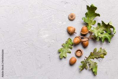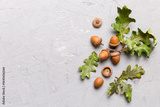 Branch with green oak tree leaves and acorns on colored background, close up top view