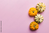 Autumn composition of little orange pumpkins on colored table background. Fall, Halloween and Thanksgiving concept. Autumn flat lay photography. Top view vith copy space