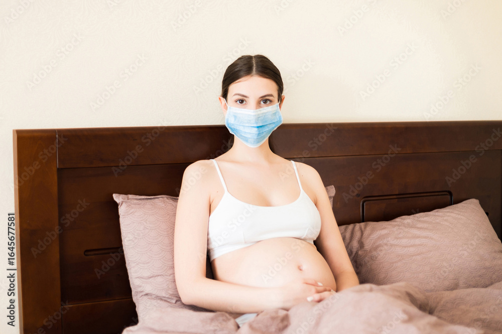 Young pregnant woman in protective medical mask is staying in bed because of coronavirus. Quarantine time. Health care concept