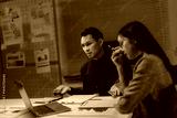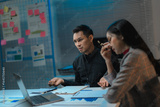 Business people working late and looking worried at laptop in office meeting room